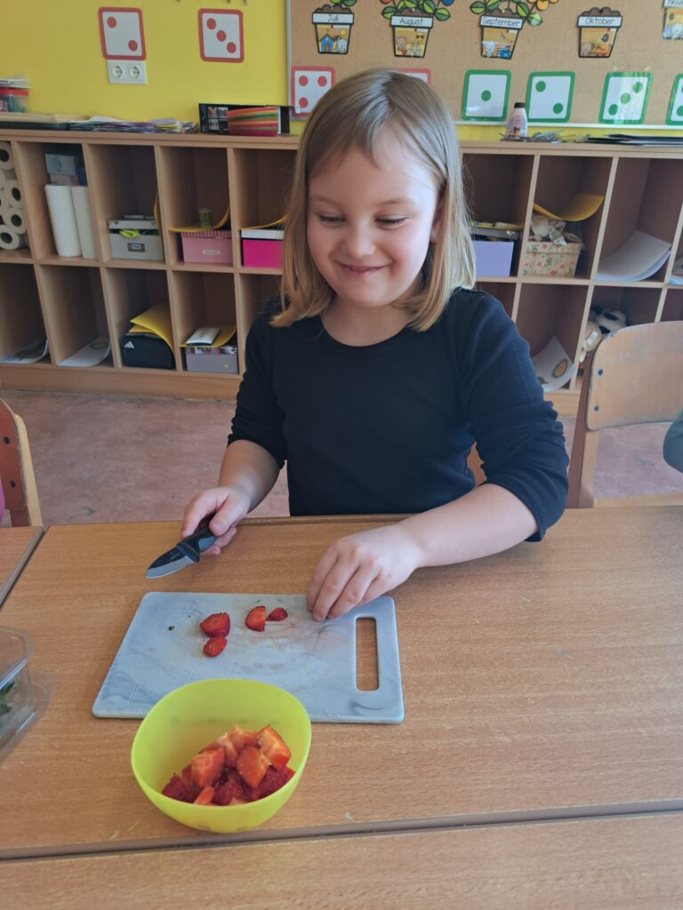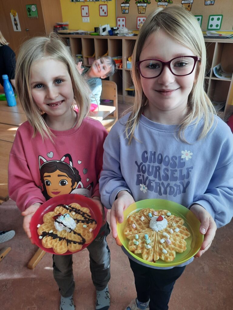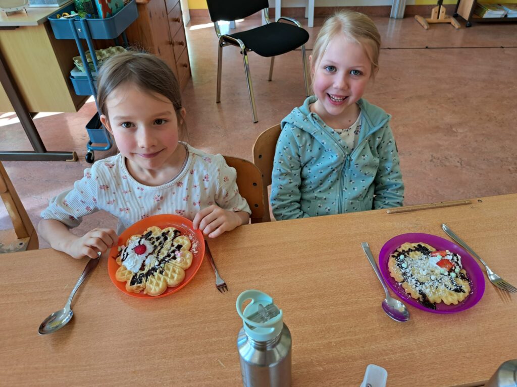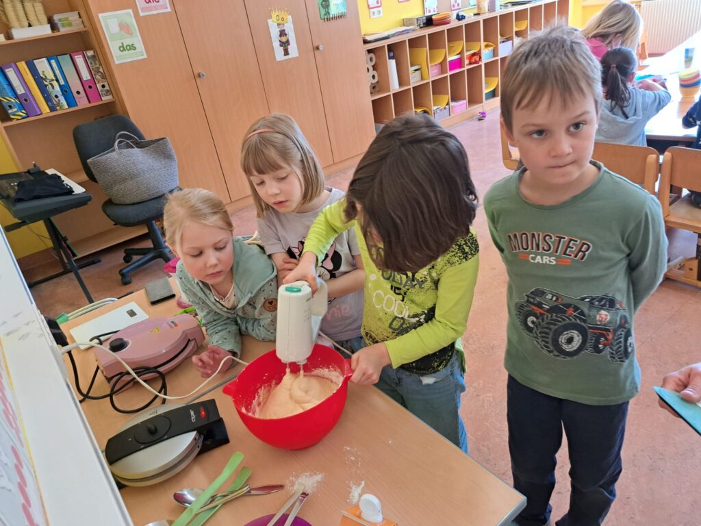 Ist der Buchstabe Ww gelernt, wird das Waffeleisen angeworfen. Die Erstklässler bereiteten selbst Teig zu und schnitten Obst. Was für eine herrliche Buchstabenjause!