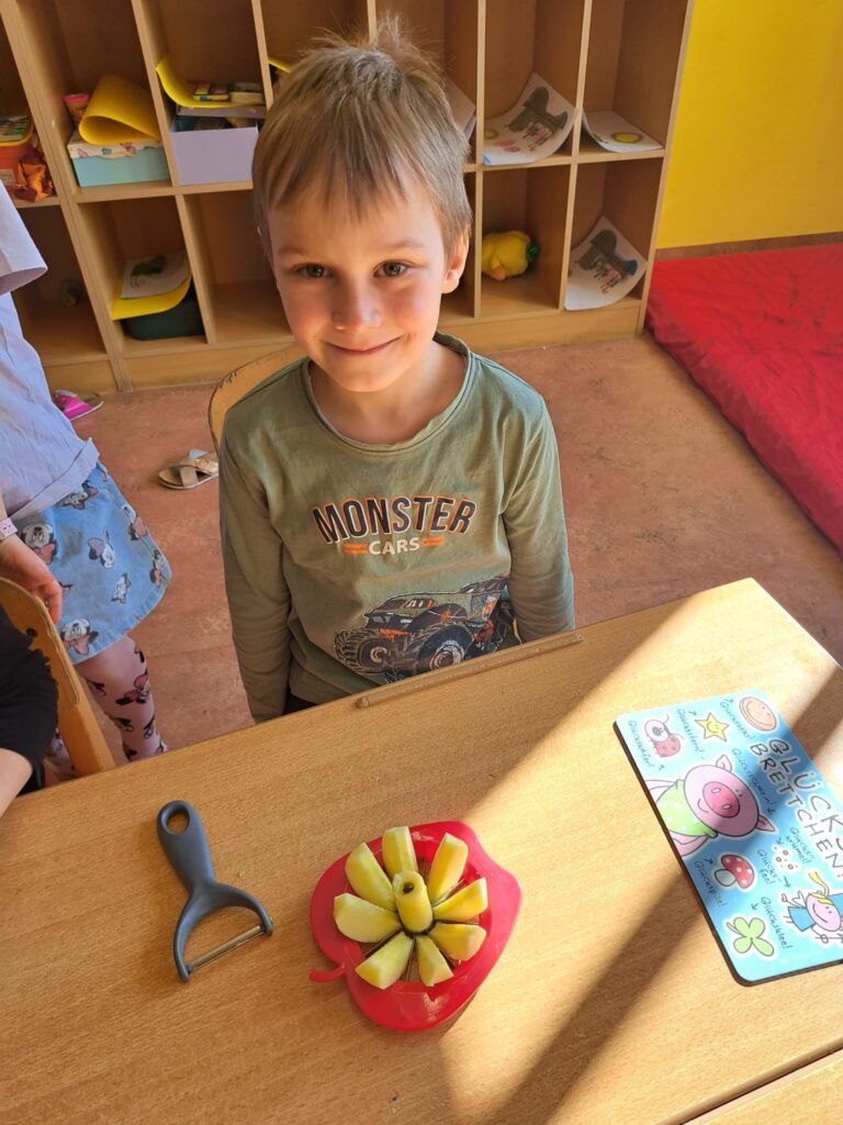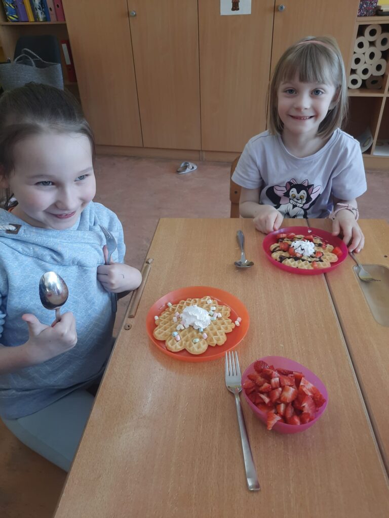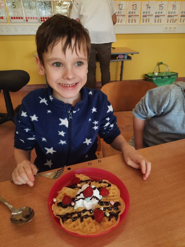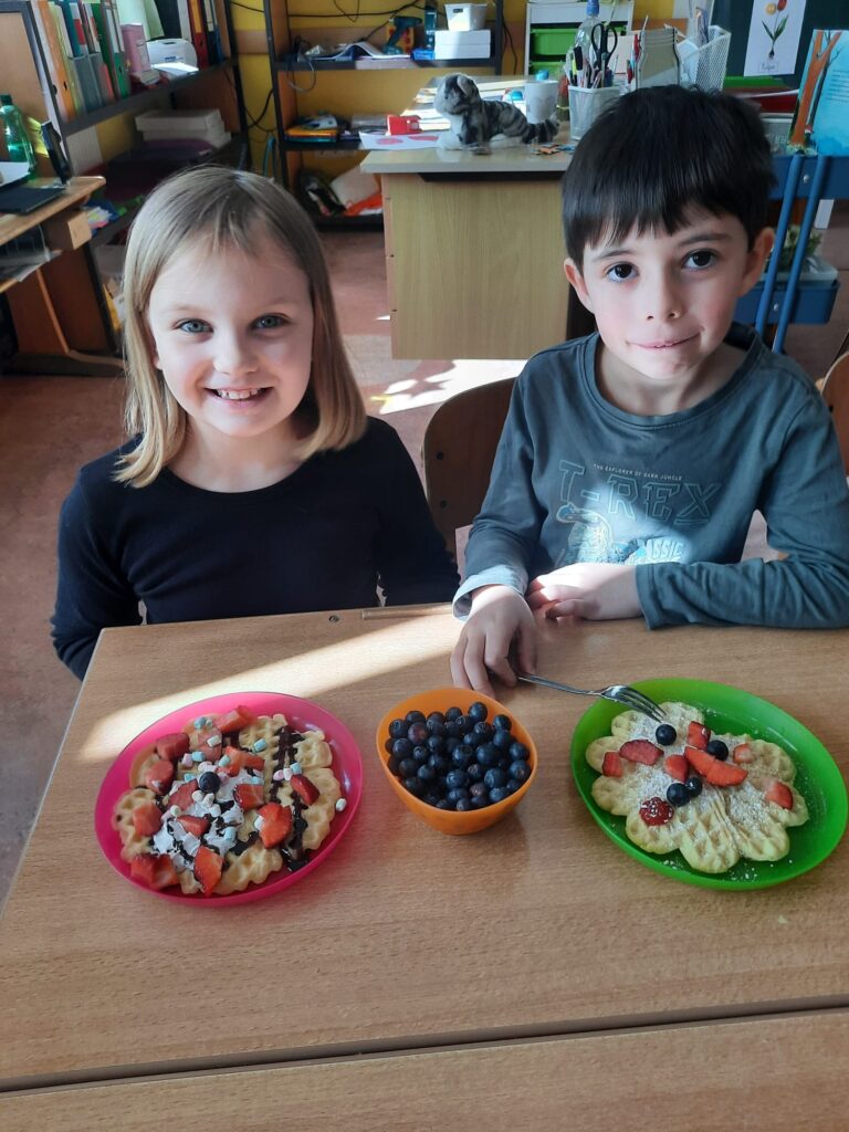 Ist der Buchstabe Ww gelernt, wird das Waffeleisen angeworfen. Die Erstklässler bereiteten selbst Teig zu und schnitten Obst. Was für eine herrliche Buchstabenjause!