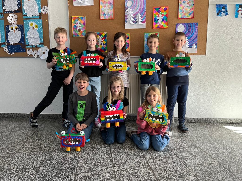 Im Rahmen unserer Unverbindlichen Übung Kreatives Gestalten haben die Kinder einen Polster aus Filz gemacht und aus einer leeren Taschentücherbox wurde ein lustiges Monster-Gesicht gestaltet.